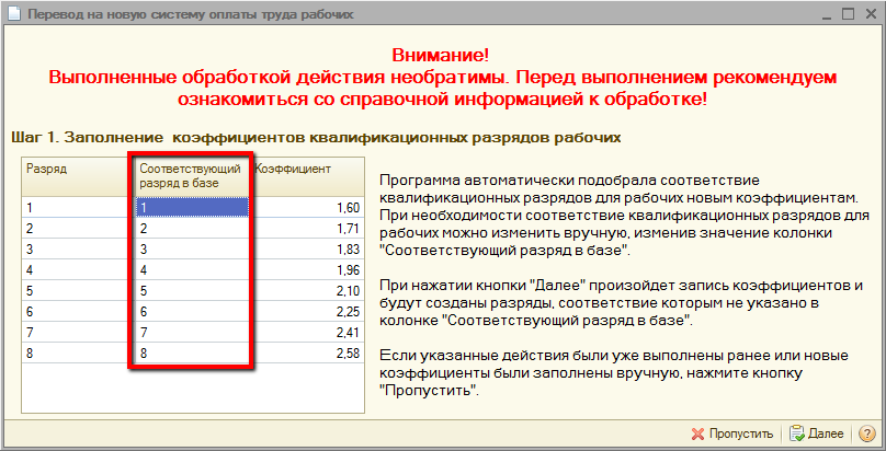 На первом шаге обработки производится автоматическое заполнение регистра сведений «Коэффициенты квалификационных разрядов».