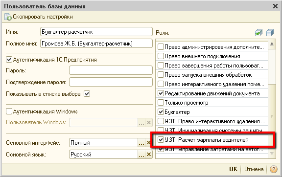 Для работы с подсистемой расчета зарплаты водителей, в редакции 1.1 конфигурации «1С-Рейтинг: Управление затратами на автотранспорт. Путевые листы» добавлена специальная роль «УЗТ: Расчет зарплаты водителей», поэтому необходимо у пользователя, который будет работать с этой подсистемой, установить дополнительно роль «УЗТ: Расчет зарплаты водителей».