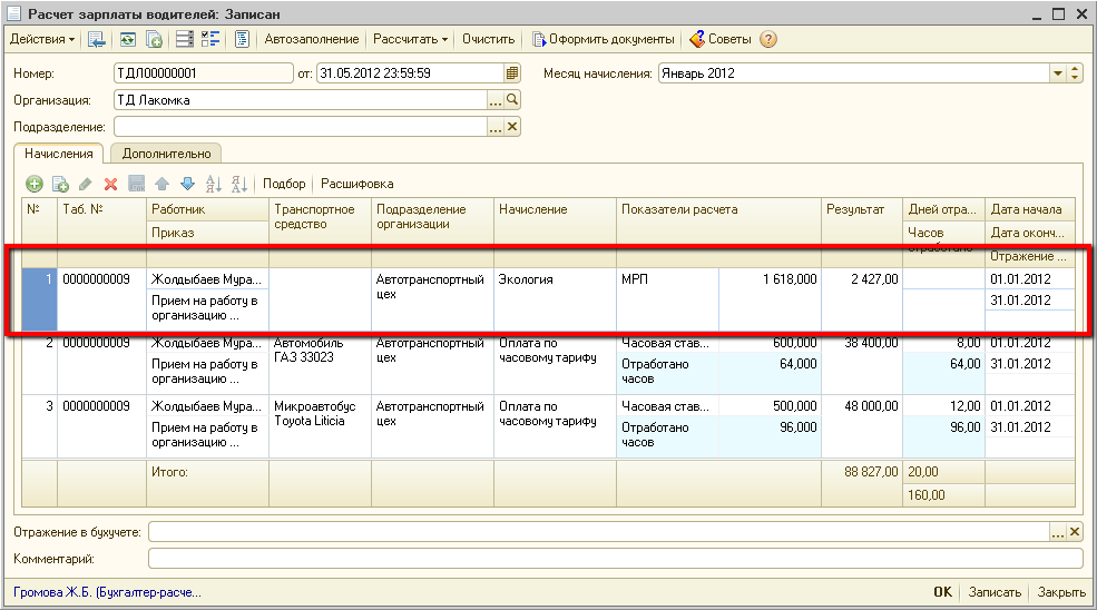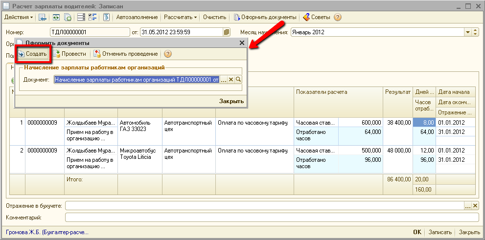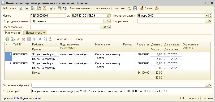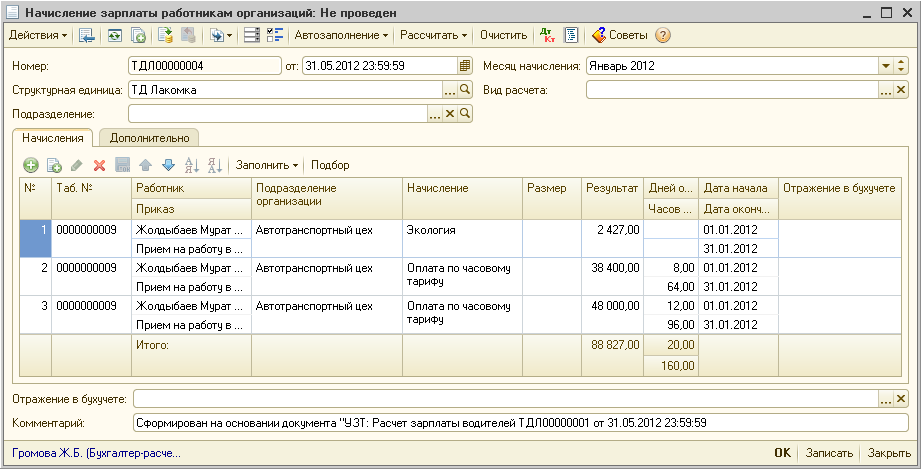 Перезаполним и выполним перерасчет ранее введенного документа «Расчет зарплаты водителей»: