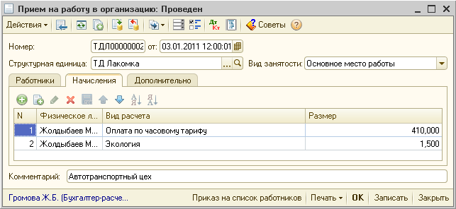 Добавим в документ приема на работу водителя плановое начисление «Экология»: