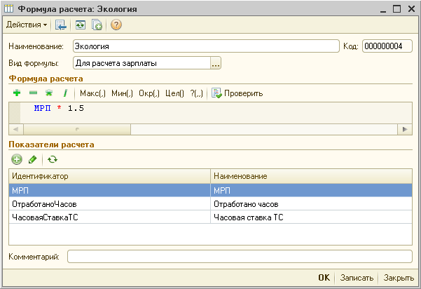 Начисление «Экология» в примере рассчитывается как произведение месячного расчетного показателя на коэффициент 1.5. Создадим для такого алгоритма новую формулу расчета «Экология» (меню «Транспорт» — «Настройка расчетов» — «Формулы расчета»):