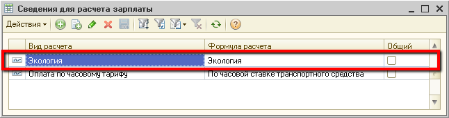 В сведениях для расчета зарплаты, зададим формулу расчета для начисления «Экология» (меню «Транспорт» — «Расчет зарплаты» — «Сведения для расчета зарплаты»):