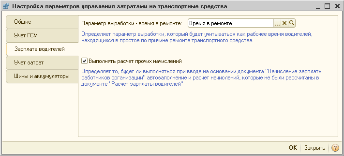 Выполнить расчет начисления «Экология» можно было и без использования специализированного механизма расчета зарплаты водителей. В конфигурации предусмотрена возможность автоматизированного расчета тех плановых начислений, для которых не задана формула расчета. Для этого достаточно в настройках параметров учета (меню «Транспорт» — «Настройки параметров учета») установить флажок «Выполнять расчет прочих начислений» на закладке «Зарплата водителей»: