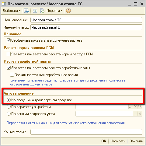В свойствах заполнения показателя «Часовая ставка ТС» установлено правило заполнения «Из сведений о транспортном средстве»: