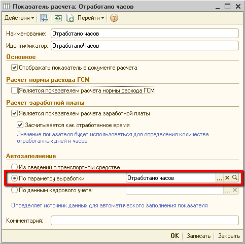 - Отработано часов — значение показателя задается на закладке «Выработка» документа «Путевой лист».