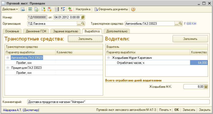 В путевом листе для транспортного средства «Микроавтобус Toyota Liticia» в табличной части «Водители» на закладке «Выработка» заполняем отработанное время у водителя - 96 часов, в реквизите «Всего отработано дней водителями» указываем количество отработанных дней — 12: