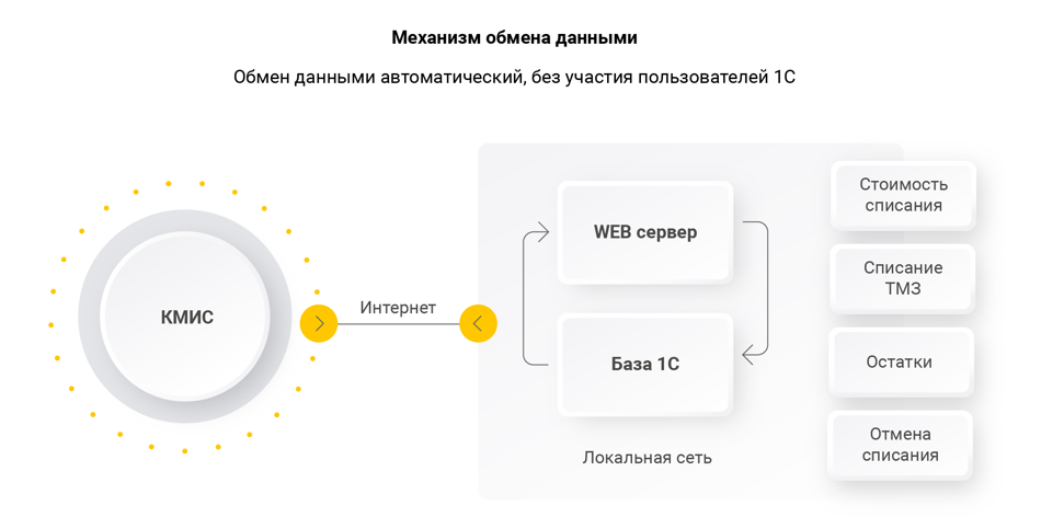 Сервис обеспечивает гарантированную передачу информации о стоимости списанных ЛС и ИМН из 1С в КМИС Damumed. Стоимость считается переданной только после того, как КМИС подтвердит ее получение. В случае отмены (удаления) списания медикаментов, если стоимость еще не была получена системой КМИС – отправка данных отменяется на стороне 1С. В случае корректировки данных списания, происходит повторная отправка.