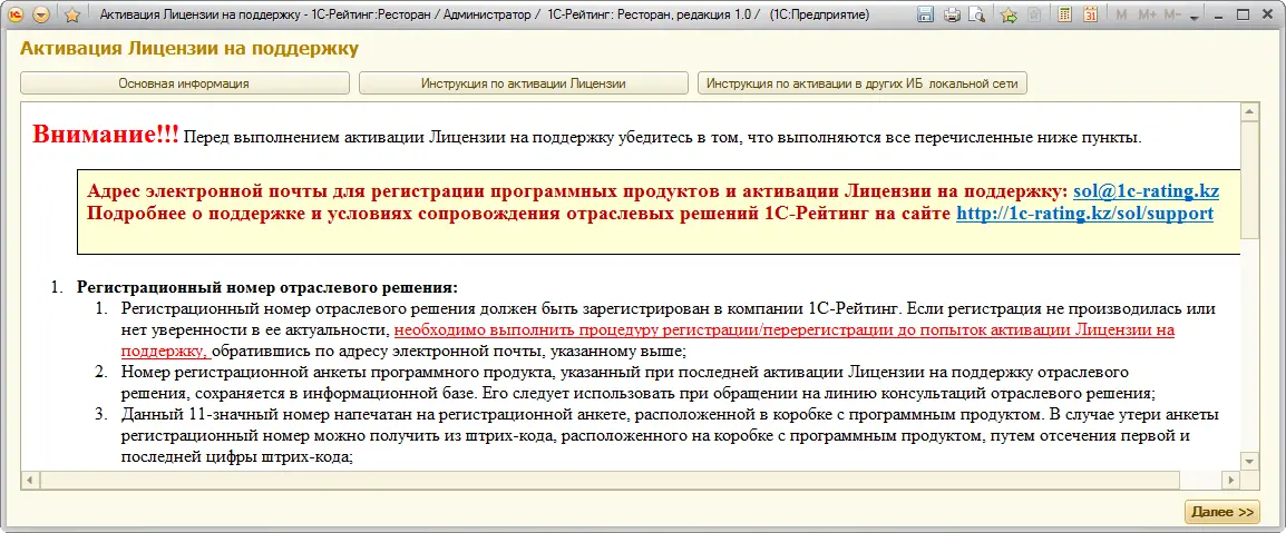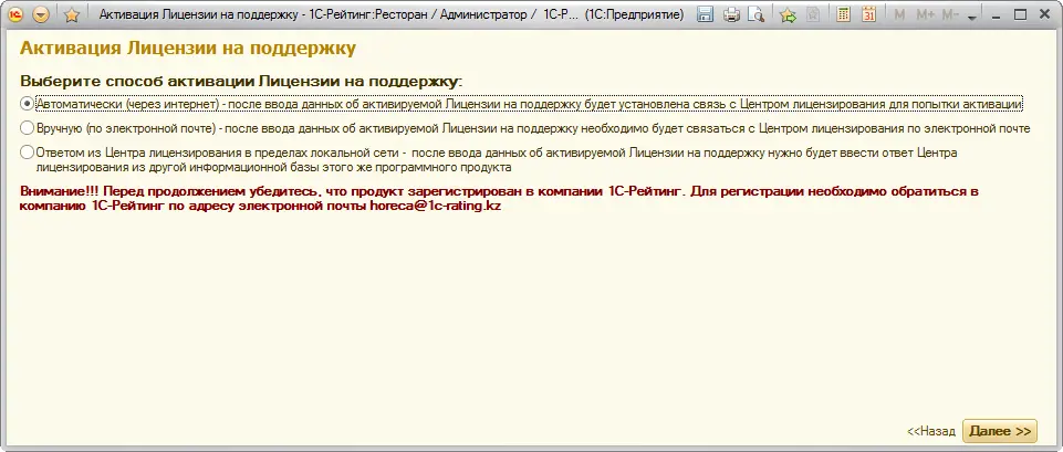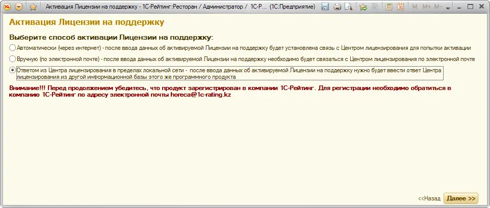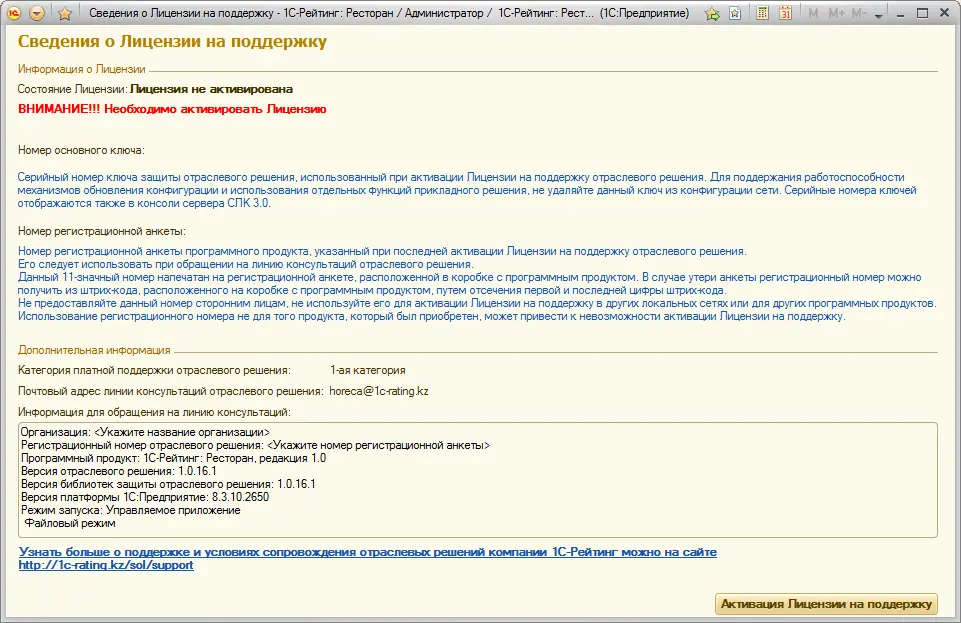 Внимание!!! До выполнения попыток активации Лицензии на поддержку необходимо зарегистрировать программный продукт в компании 1С-Рейтинг, чтобы указанный при активации регистрационный номер мог быть использован.