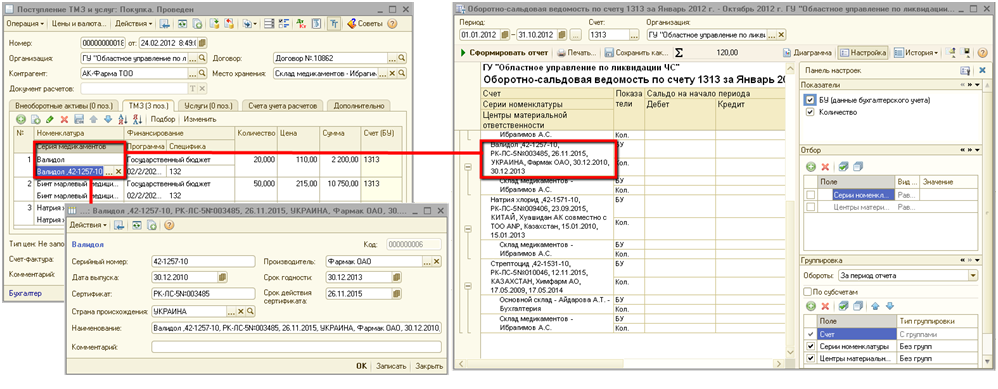 Учет медикаментов ведется по срокам годности и серийным номерам. Сведения по сериям медикаментов вводятся при оформлении первичных документов по движению запасов и могут быть проанализированы с помощью стандартной бухгалтерской и специфической отчетности.