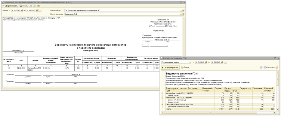 Предусмотрено формирование Ведомости на списание ГСМ (форма 457) Альбома форм и ведомости движения ГСМ.
