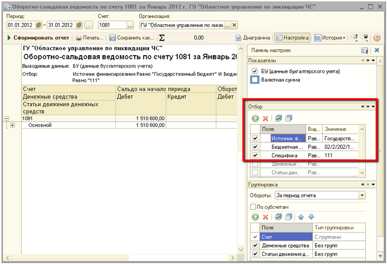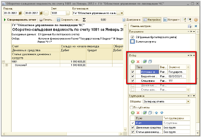 Стандартные и специализированные отчеты имеют широкие возможности группировки, отбора, сортировки данных, оформления и т.д., позволяют оперативно получать необходимые регистры учета и представлять бухгалтерскую информацию в удобном для анализа виде, в том числе в разрезе статей бюджетной классификации.