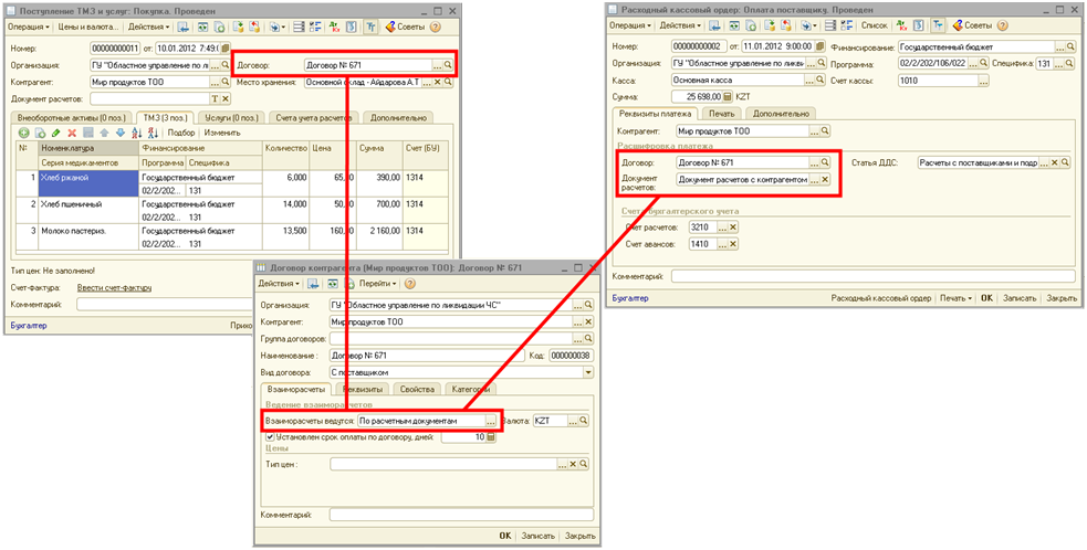 Учет расчетов с контрагентами ведется в разрезе заключенных договоров, как в тенге, так и в иностранной валюте. При этом курсовые и суммовые разницы по каждой операции рассчитываются автоматически.
