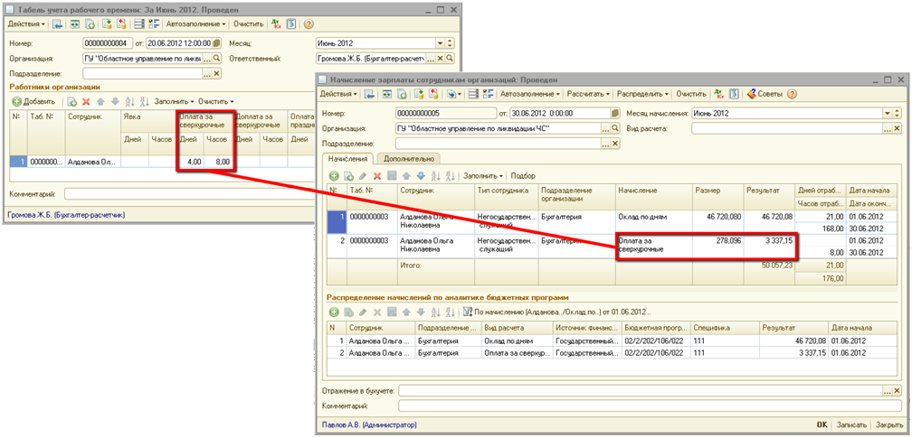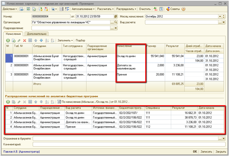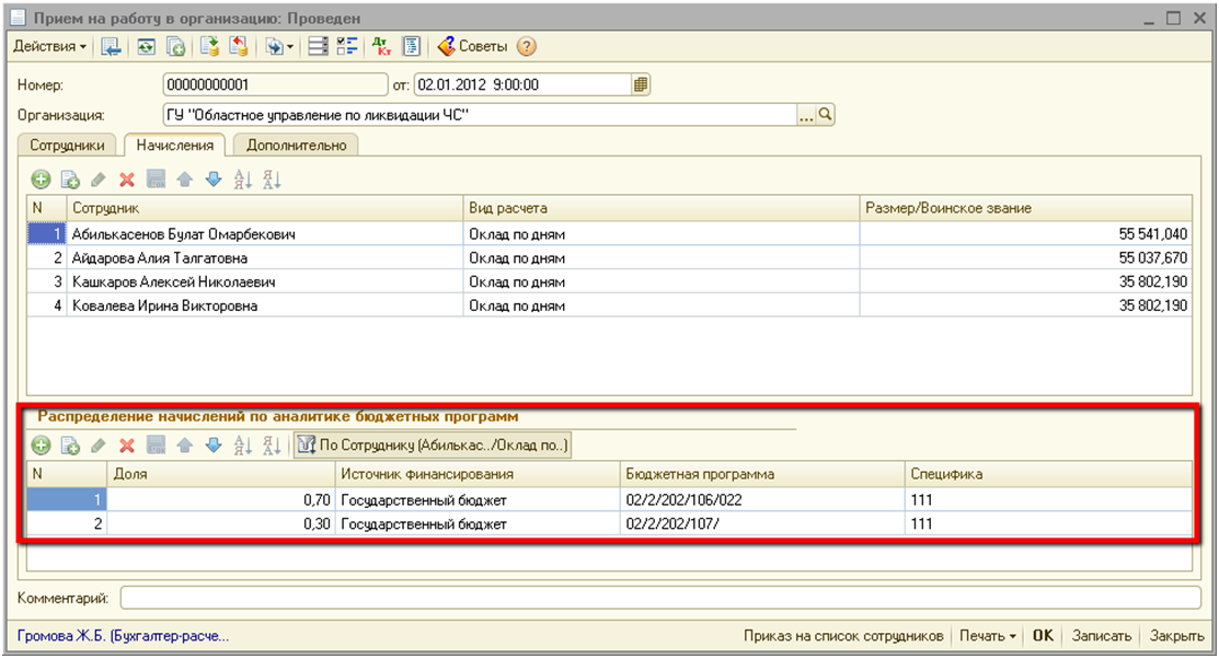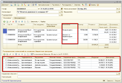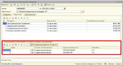 При начислении заработной платы сотрудникам производится автоматическое распределение различных форм оплаты труда по статьям бюджетной классификации, согласно установленным долям распределения.