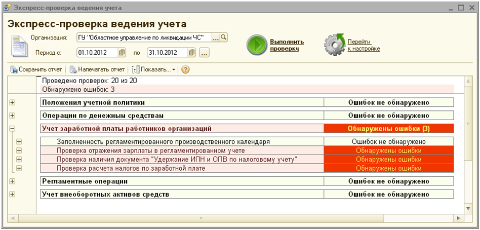 Экспресс-проверка представляет собой набор проверок, сгруппированных по разделам учета. Каждая такая проверка контролирует отсутствие ошибок в данных информационной базы. Контроль может заключаться в соответствии учетных данных тем или иным положениям законодательства или в соответствии данных внутренним алгоритмам, заложенным в программу разработчиком. Выполнив экспресс-проверку, пользователь получает отчет о ее результатах, в котором показывается общее число проведенных проверок и число проверок, в ходе выполнения которых были обнаружены ошибки в данных информационной базы.