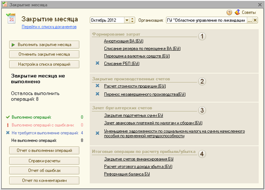 Помощник закрытия месяца представляет собой обработку, с помощью которой можно проанализировать какие операции необходимо выполнить в конце отчетного периода, а также осуществить контроль их выполнения с помощью специализированных отчетов.