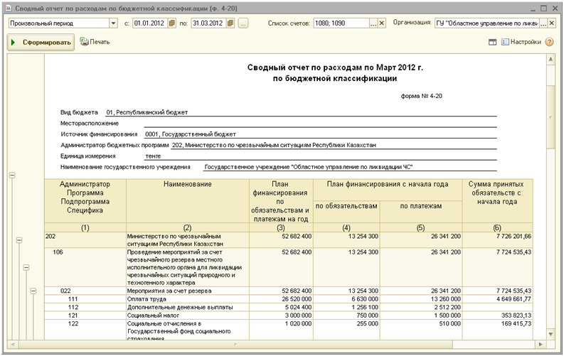 Для обеспечения контроля над расходованием бюджетных средств, а также проведения сверки бухгалтерских записей по счетам учета плановых назначений с территориальными подразделениями казначейства, предусмотрено формирование отчета формы 4-20 «Сводный отчет по расходам».