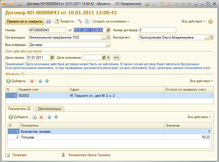 Для регистрации владельца лицевых счетов и значений показателей, по которым будет производиться расчет начислений, используется документ «Договор».