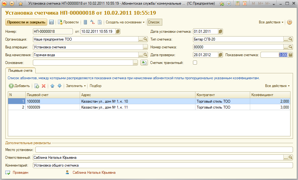 В прикладном решении предусмотрен учет транзитных и общих счетчиков, что позволяет гибко настроить правила расчета начисления абонентской платы. Счетчик может быть установлен для любого вида начисления (холодная вода, горячая вода, газ и т.д.). При этом на один вид начисления может быть установлено неограниченное количество счетчиков (например, несколько счетчиков холодной воды в одной квартире).