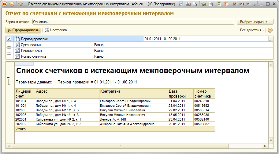- отчет по счетчикам с истекающим межповерочным интервалом;