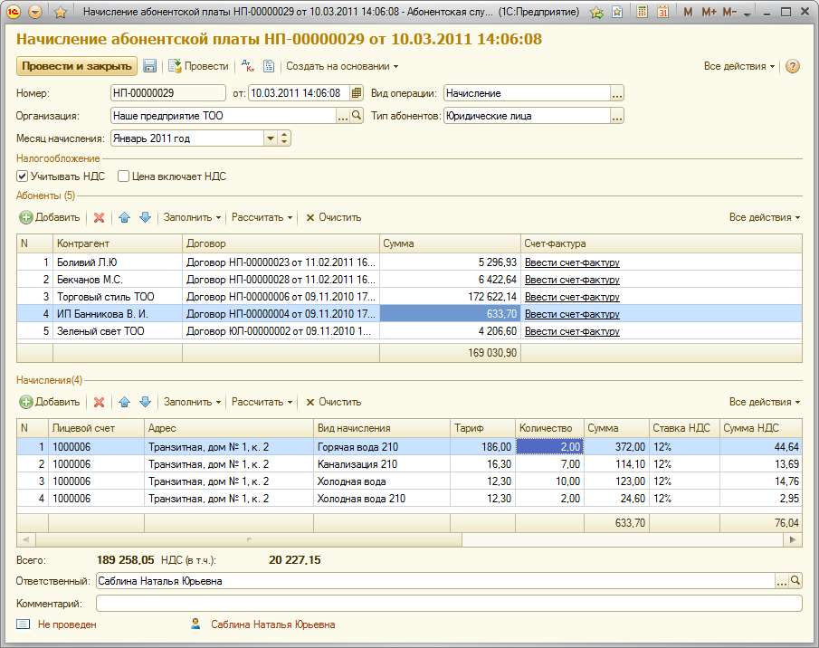В прикладном решении реализована возможность регистрации факта оказания разовых услуг абонентам (например, услуга подключения к центральному водоснабжению).