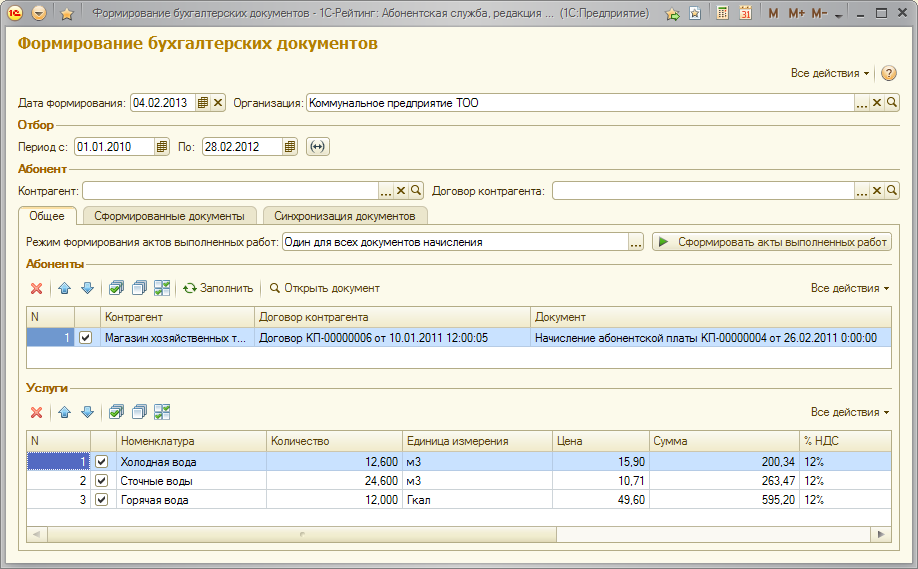 Прикладное решение «1С-Рейтинг: Абонентская служба» предназначено для ведения взаиморасчетов с абонентами, расчета начислений за предоставленные им коммунальные услуги различных видов деятельности (потребление холодной воды, горячей воды, канализации, электроэнергии, газа, отопление помещений и т.д.), а также за оказание услуг технического обслуживания. Начисление платы за коммунальные услуги может выполняться как по установленным нормативам потребления, так и по данным приборов учета.