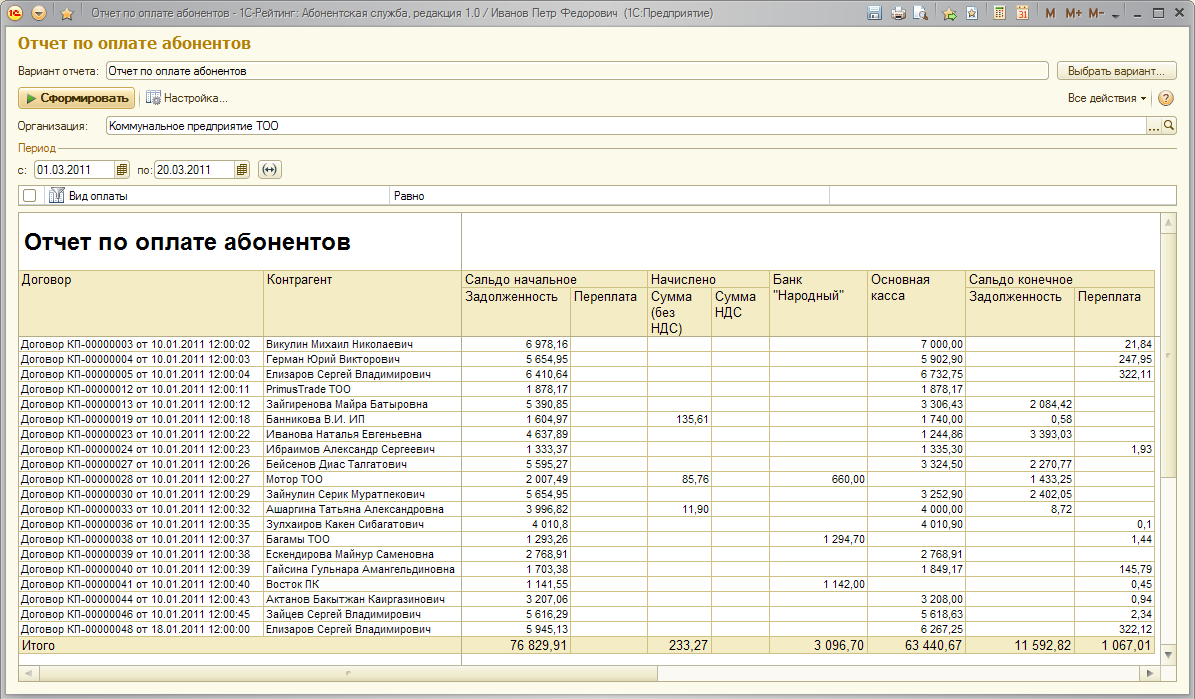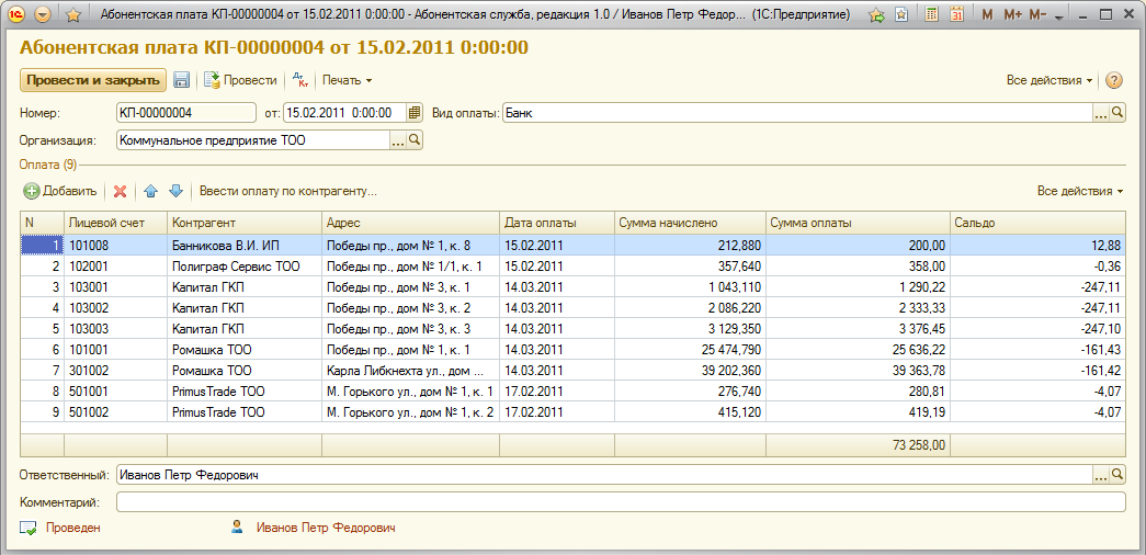 Документ «Абонентская плата» заполняется списком абонентов и не предоставляет возможности печати квитанций. В шапке документа должен быть указан вид оплаты (касса, банк). При оформлении оплаты абонента в документе отражается информация о текущей задолженности и значение конечного сальдо.