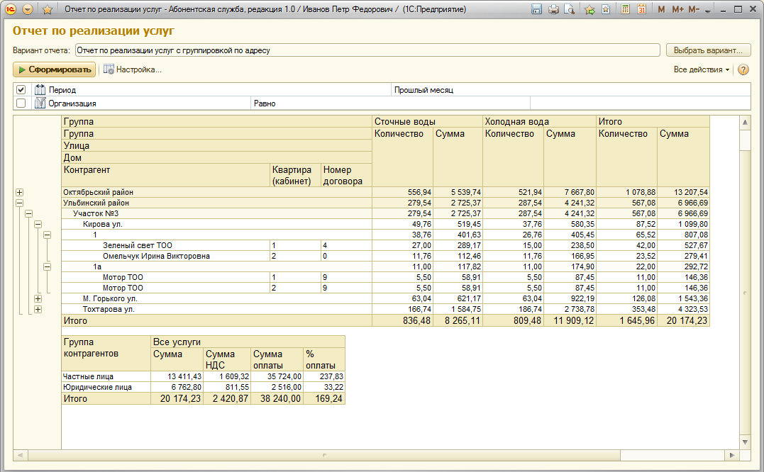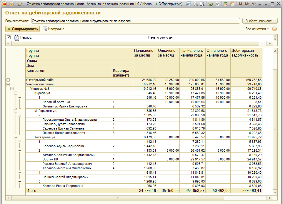 В прикладном решении реализован ряд универсальных отчетов, с помощью которых можно получить информацию о начислениях, оплате, задолженности, количестве подключенных счетчиков и прочих данных. В программе предусмотрена возможность печати квитанций о начислении за коммунальные услуги.