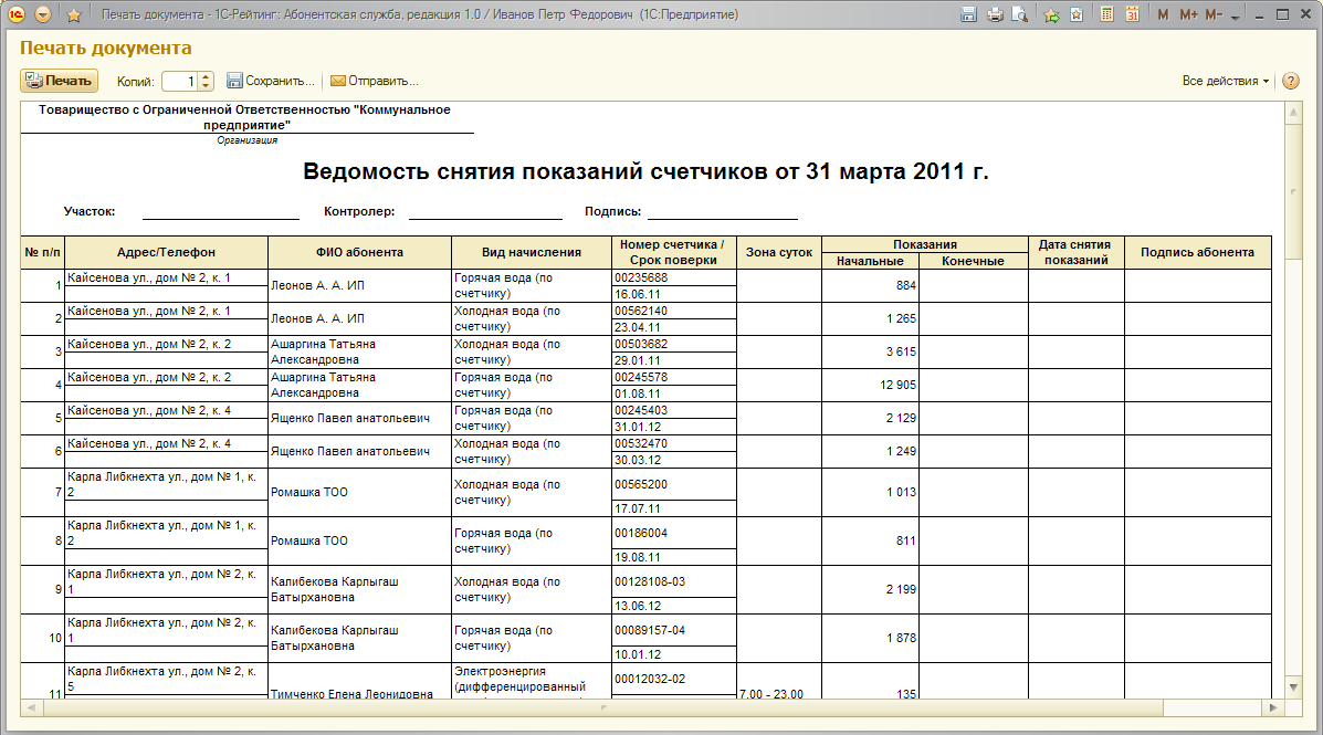 Для формирования «Ведомости снятия показаний счетчиков»в конфигурации предусмотрена одноименная обработка, она позволяет сформировать печатную форму, необходимую для снятия показаний контролерами.
