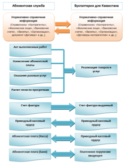 На схеме изображены общие принципы взаимодействия объектов конфигураций «Абонентская служба» и «Бухгалтерия для Казахстана» при обмене.