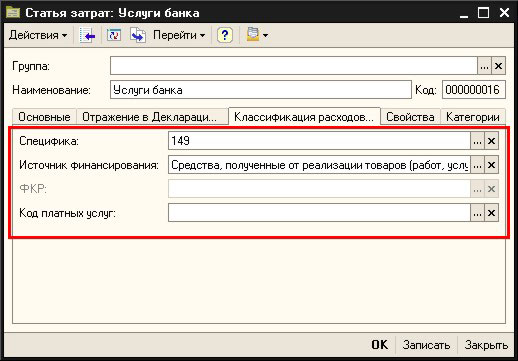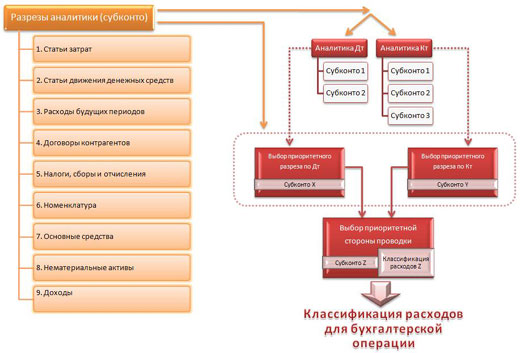 Для каждого элемента справочника, выступающего в роли аналитического разреза бухгалтерских операций (субконто), предусмотрена возможность указать определенную статью классификации расходов.
