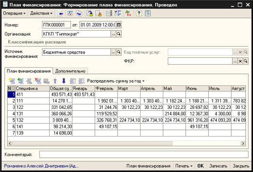- Формирование плана финансирования – занесение первоначального плана финансирования;