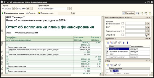 В конфигурации предусмотрена возможность ввода планов финансирования в разрезе статей классификации на год и отслеживания фактического исполнения планов на основании данных бухгалтерского учета.