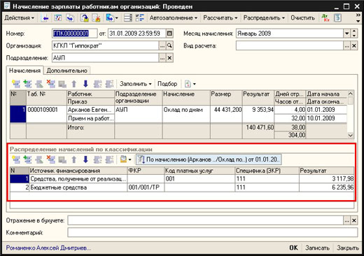 В конфигурации предоставлена возможность расчета заработной платы и учета расчетов с работниками в разрезе статей классификации расходов (источников финансирования, функциональной и экономической классификации расходов). Расчет заработной платы по статьям классификации производится автоматически в соответствии с данными кадрового учета. Кадровый учет и расчет заработной платы имеют ряд особенностей, обусловленных спецификой учета в государственных предприятиях, наиболее важной из которых является распределение результатов расчета начислений, удержаний, налогов, взносов и отчислений по статьям классификации расходов. Результат распределения по статьям представлен в нижней части формы первичных документов, в табличной части «Распределение начислений по классификации». При необходимости, пользователь может изменять результаты расчета, либо заново выполнить автоматическое распределение без пересчета суммы начисления.