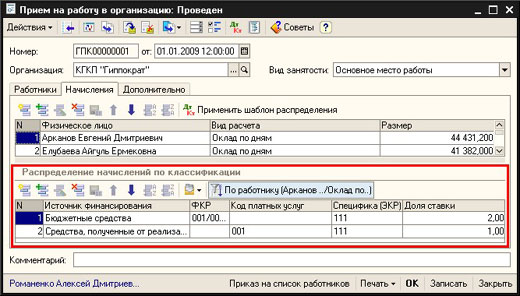 Для задания распределения начисления отдельного сотрудника по классификациям используются данные кадрового учета. Для этого в документах «Прием на работу в организацию» и «Кадровое перемещение организаций» на закладке «Начисления» к каждой строке табличной части начислений, в нижней табличной части («Распределение начислений по классификациям»), указывается список статей классификации, на которые необходимо относить данное начисление. Начисление можно отнести целиком (если указывается одна строка классификации), либо распределить на несколько статей в соответствии с указанными пропорциями в колонке «Доля ставки».