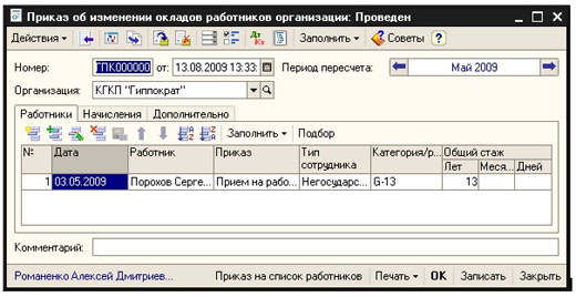 Для сотрудников, размер основных начислений которых зависит от величины стажа, предусмотрен автоматический пересчет стажа и размера начислений ежемесячно (для тех, у кого в определенном месяце изменяется число полных лет стажа). Пересчет производится и утверждается при помощи специализированного документа «Приказ об изменении окладов работников организации».