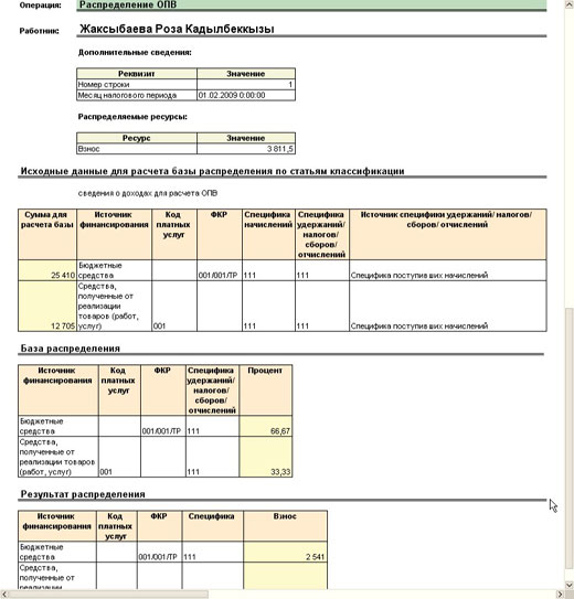 Удержания, налоги, сборы и отчисления, исчисленные для работника, распределяются по статьям классификации пропорционально суммам начисленных доходов по данным статьям. При этом можно получить подробный отчет о результатах распределения.