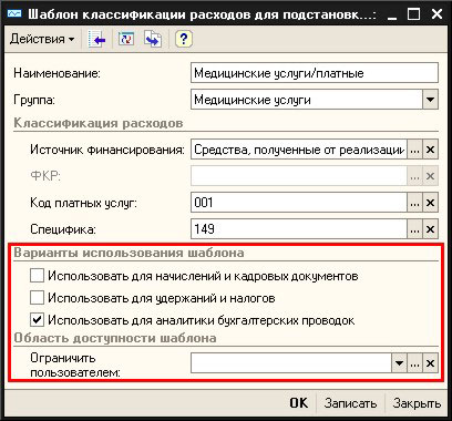 Можно ограничивать область видимости шаблонов определенными областями использования (для начислений, для удержаний, для субконто и т.д.) либо пользователями.