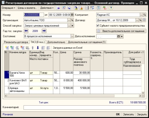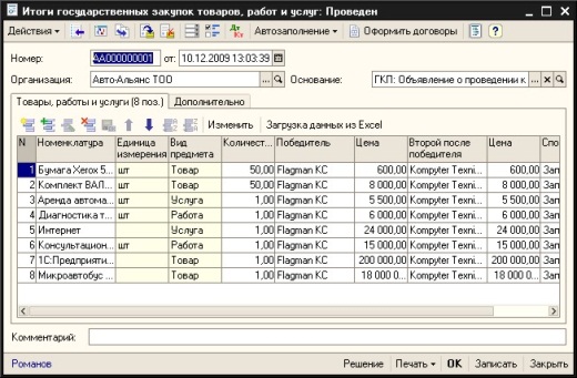 Программный продукт предоставляет средства автоматизации работы отдела государственных закупок: от подачи заявок подразделений организации на приобретение ТМЗ (работ/услуг) и проведения конкурсов, до регистрации договоров с поставщиками и контроля исполнения обязательств по ним. В состав решения включен комплект форм регламентированных отчетов, утвержденных Приказом Министра финансов Республики Казахстан от 30 декабря 2008 года № 647 «Об утверждении Правил сбора, обобщения и анализа отчетности с учетом информации об объемах казахстанского содержания при закупках товаров, работ, услуг».