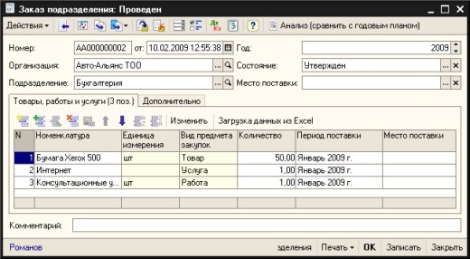 - сбор текущих заявок от подразделений на приобретение товаров, работ и услуг, отслеживание превышения заявок над годовым планом;