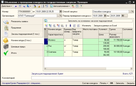 Регистрация проведения конкурсов по государственным закупкам осуществляется на основании накопленных заказов подразделения на приобретение товаров, работ и услуг. Факт проведения конкурса регистрируется в объявлении о проведении конкурса.