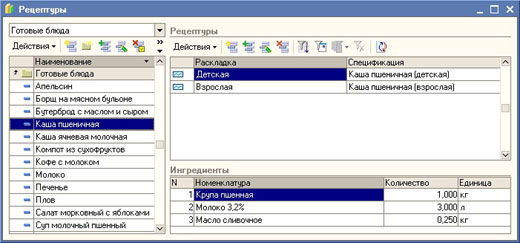 - хранение в информационной базе нормативов списания продуктов на приготовление готовых блюд по раскладкам (рецептур);