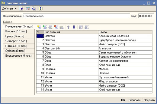 В справочнике, для каждого дня недели устанавливается список видов питания (завтрак, обед и т.д.) и блюд.