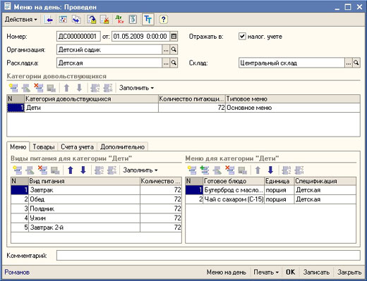 Для составления меню на день с указанием категории довольствующихся (дети, персонал и т.п.), количества питающихся, а также состава готовых блюд на каждое кормление (завтрак, обед, полдник и т.п.), используется документ Меню на день.