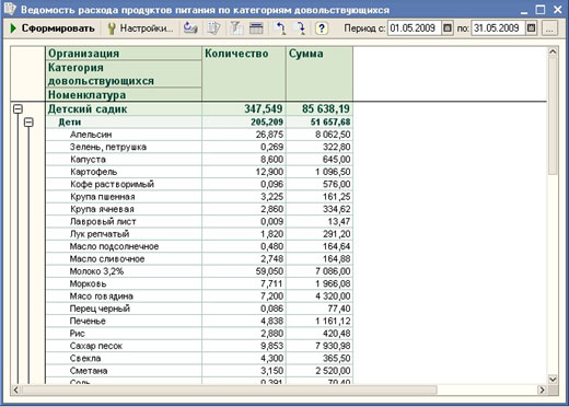 Подсистема питания, конфигурации «1С-Рейтинг: Учет родительской оплаты и питания в детских учреждениях», содержит набор специализированной отчетности, дополняющий возможности типового решения и предназначенный для анализа результатов деятельности предприятия по учету продуктов питания.