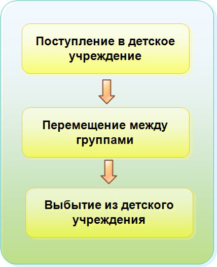 - регистрация кадровых событий: перевод детей из группы в группу, принятие новых детей, выбытие детей;
