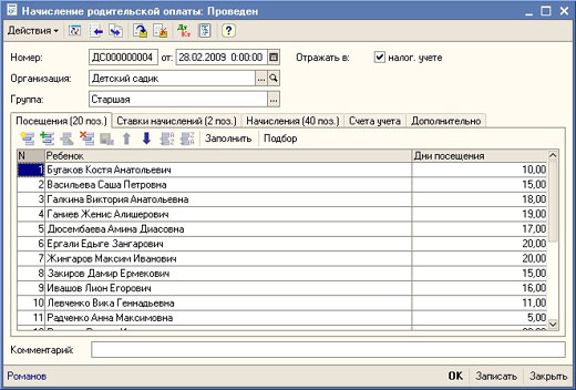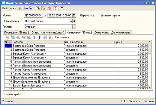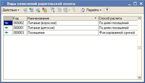 В подсистеме учета родительской оплаты предусмотрена возможность описания произвольного количества видов начислений за услуги, предоставляемые детским учреждением.