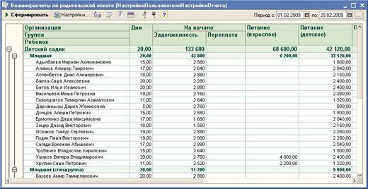 - формирование специализированного отчета по взаиморасчетам в разрезе детей и групп.