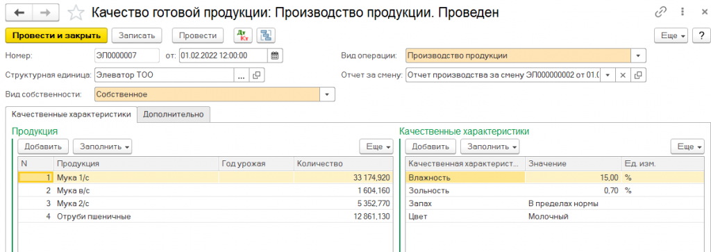 При оформлении операций оприходования готовой продукции на склад, отгрузке продукции покупателям или списания по каким-либо причинам, регистрируются показатели качества готовой продукции.