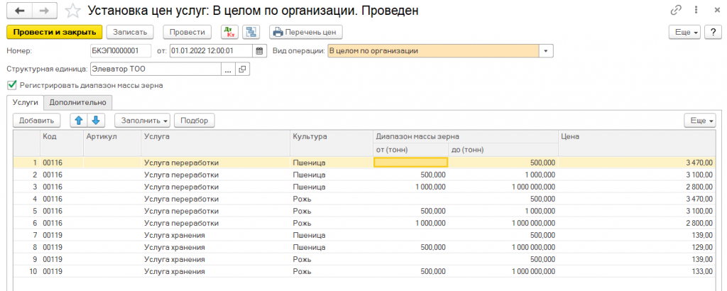 Значения цен, предоставляемых хлебоприемным предприятием услуг, могут быть установлены в целом для организации или в пределах определенного договора с контрагентом (заказчиком).