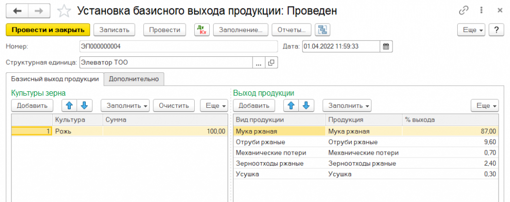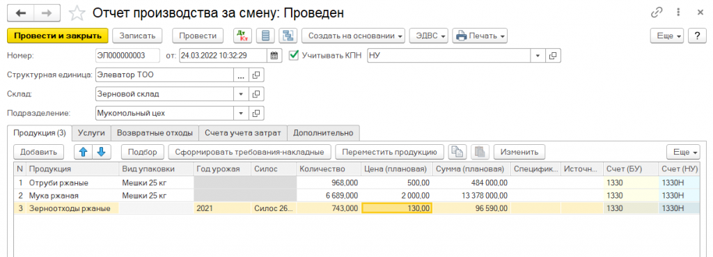 Выпуск и оприходование на склад готовой продукции, произведенной из собственного и давальческого зерна, оформляется с помощью документа Отчет производства за смену. Документ может быть введен на основании документа Акт зачистки. В этом случае большая часть реквизитов будет заполнена автоматически.
